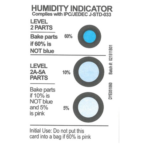 Dank seiner Konformität zu JEDEC J-STD-0033 und der frei von Kobaltdichlorid Lieferweise ist dieser Indikator nicht nur kostengünstig, sondern auch umweltfreundlich. Er ist die perfekte Ergänzung für Ihre Feuchtigkeitssperrbeutel und Trocknungsmittel, um eine effektive Lagerung und den Schutz Ihrer Produkte zu gewährleisten.